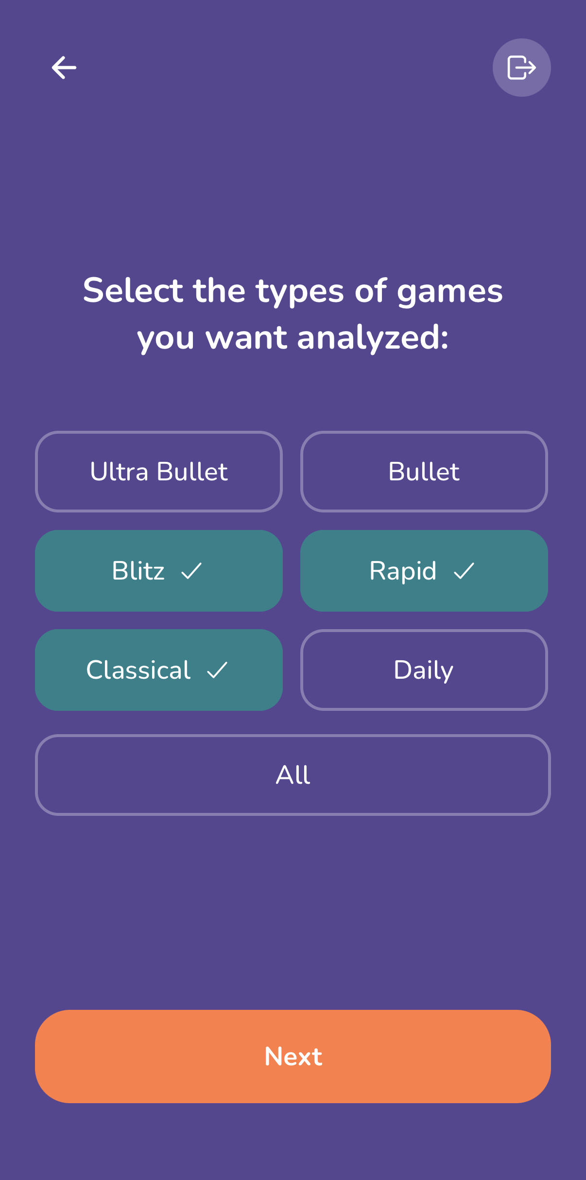 Select which time controls you want analyzed to focus on the games that matter most to you.