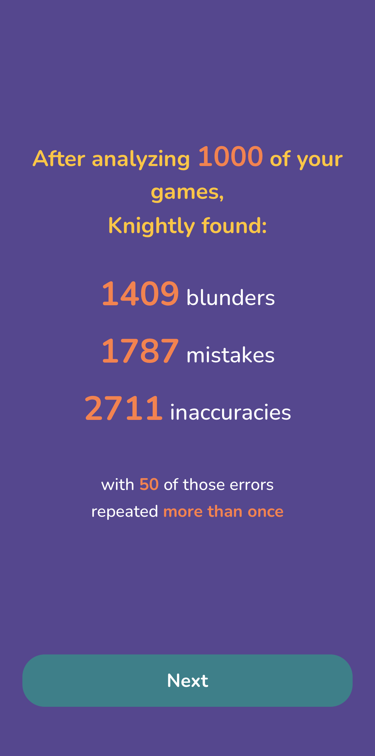 Knightly gives a breakdown of your chess errors with special attention on the ones you repeat.